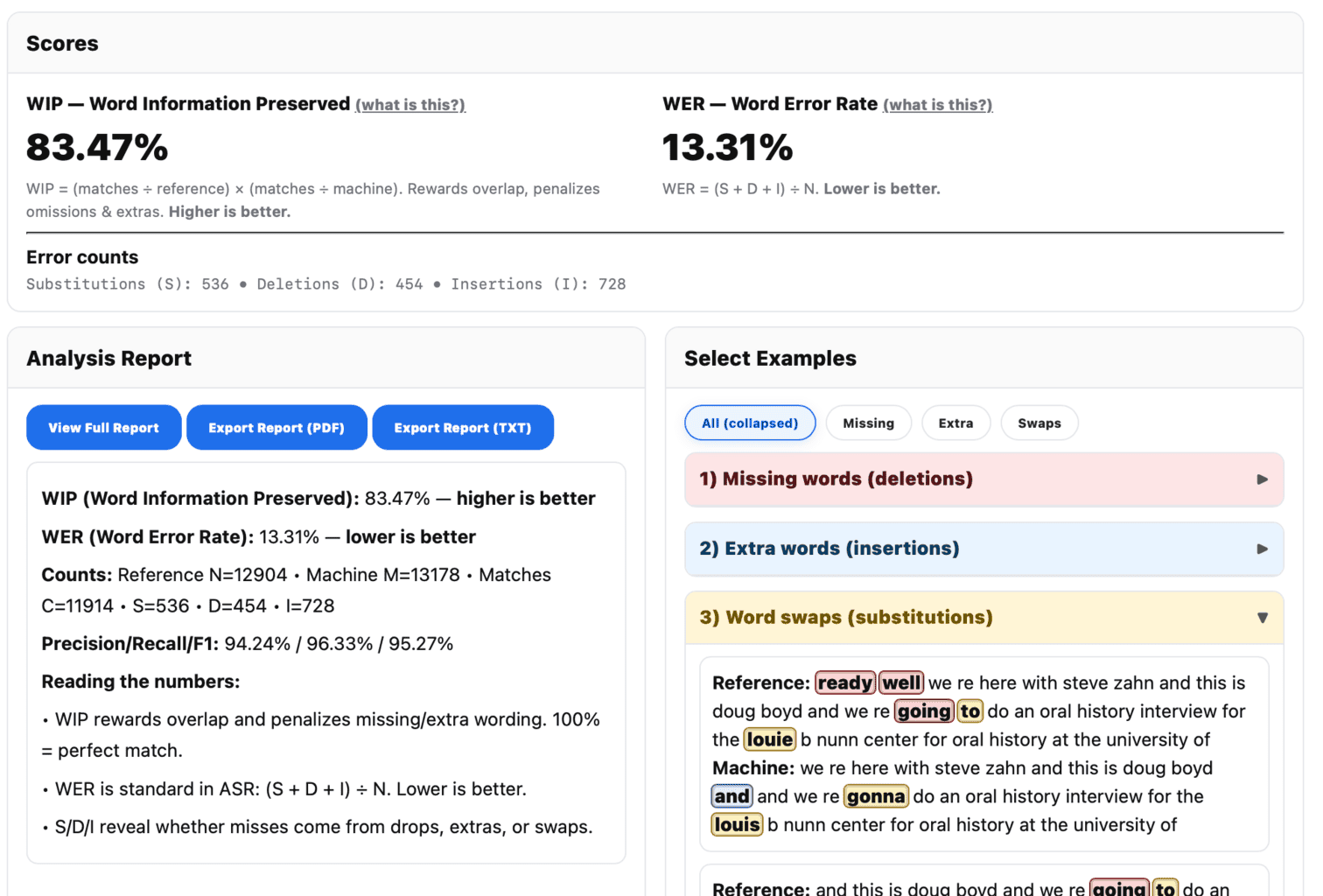 Editors’ Summary: In this post, Douglas A. Boyd introduces an open-source tool for comparing the accuracy of machine-generated transcriptions to determine which is best suited for your project. His tool, the Transcript Accuracy Auditor, compares a machine‑generated transcript to a human‑corrected reference of the same interview and provides a score for WIP (Word Information Preserved) and WER (Word Error Rate). His tool makes the evidence of accuracy visible and easily interpretable, by both archivists and engineers. The post provides instructions for using the tool and points to its known limitations.